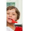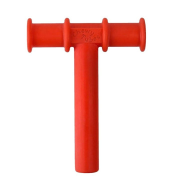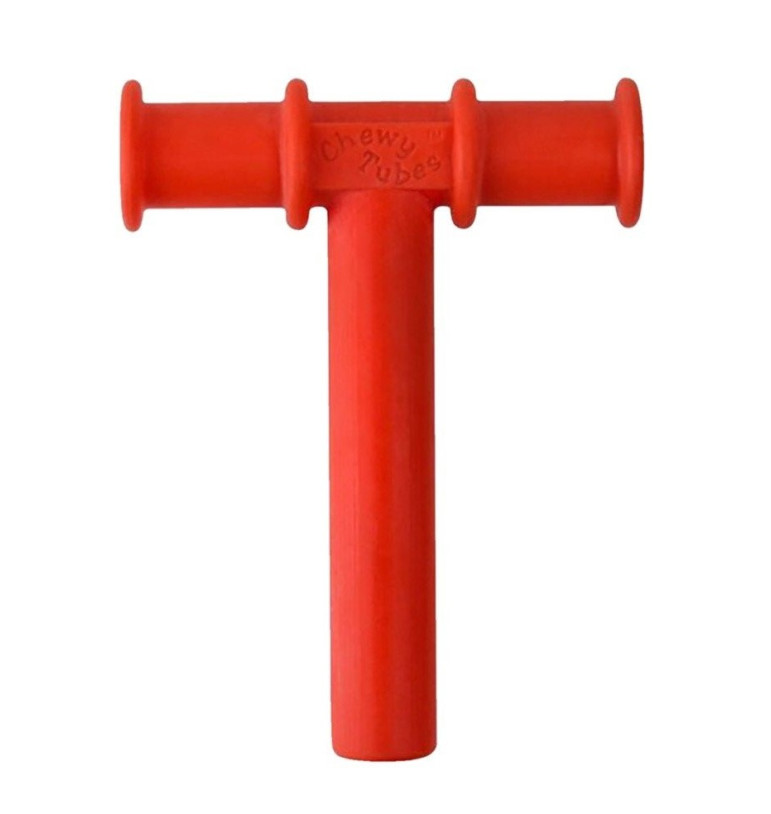 Le Chewy Tube rouge en forme de T a une longueur de tube à mâcher de 10 cm environ et un diamètre de 12 mm. Il est recommandé pour les enfants à partir de 10 mois et les adultes.