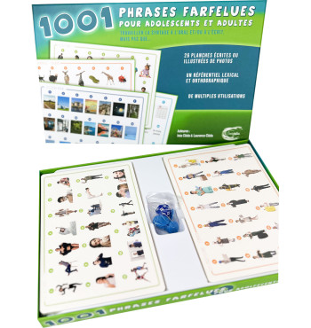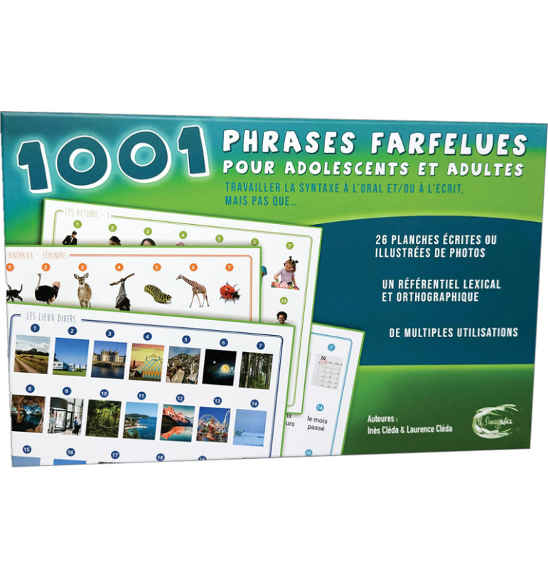 Cette boîte de jeu est destine´e a` un travail de syntaxe a` l’oral et/ou a` l’e´crit, à destination des patients adolescents et adultes. Les 26 planches contenues dans celle-ci permettront un travail personnalise´, adapte´ et surtout progressif. En effet, vous se´lectionnerez les planches en fonction des capacite´s, ainsi que des besoins de votre patient, pour lui permettre de passer de phrases courtes et simples a` des phrases longues et complexes.