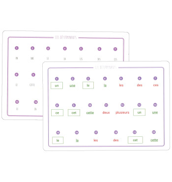à l'écrit, la planche "déterminants" vous permettra également d'indicer et/ou d'orienter votre patient dans la construction de phrases syntaxiquement et orthographiquement correctes. Pour les patients en plus grande difficulté, une variante avec des indices couleurs sera également proposée et mettra en évidence le singulier (vert), le pluriel (rouge), le masculin (encadré) et le féminin (souligné).