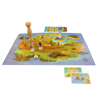 Le plateau illustre une île comportant 9 lieux différents et 3 totems identifiés par 12 numéros sur le plateau. Le patient lance le dé à 12 faces et place son pion sur le lieu ou le totem correspondant.
